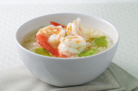 กุ้งสด 5 ตัว น้ำ 2 ถ้วย ข้าวหุง 1 ถ้วย ต้นหอมซอย ซีอิ๊วขาว เกลือป่น รากผักชี พริกไทย กระเทียมเจียว