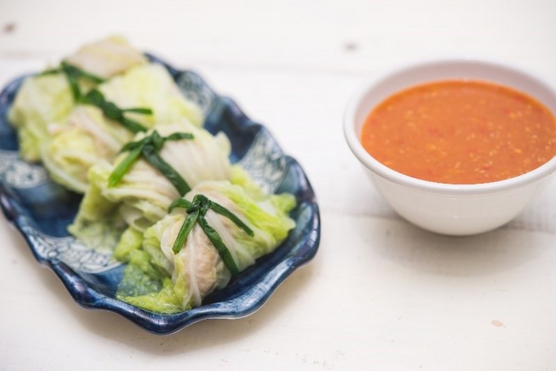 4.นำผักกาดขาวมาห่อหมูที่หมักไว้ จากนั้นเอาใบต้นหอมมามัด