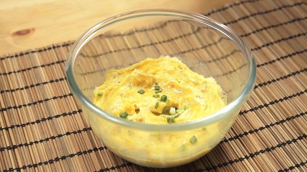 5. นำออก แล้วใช้ช้อนกวนไข่เจียวในชามให้แตก แล้วนำเข้าไมโครเวฟอีกครั้ง 1 นาที